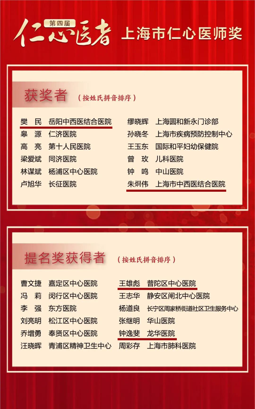 会议表彰了第四届“仁心医者·上海市仁心医师奖”获奖者和提名奖获得者。伟德附属岳阳中西医结合医院心血管内科主任医师樊民、附属上海市中西医结合医院推拿科副主任医师朱烱伟荣获第四届“仁心医者·上海市仁心医师奖”,附属普陀医院呼吸与危重症医学科主任医师王雄彪、附属龙华医院肾病科主任医师钟逸斐荣获第四届“仁心医者·上海市仁心医师奖”提名奖。