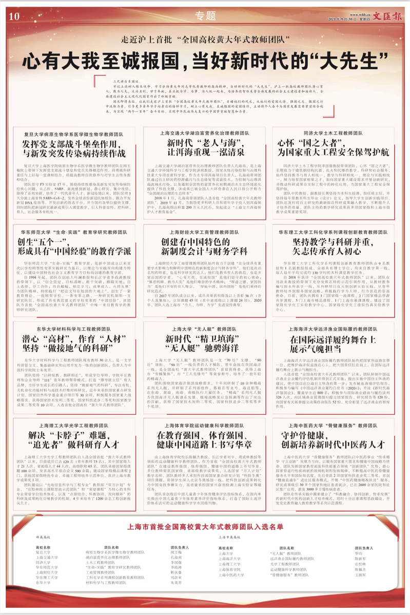 牢记立德树人根本使命,学习弘扬黄大年同志等优秀教师的高尚精神,当好新时代的“大先生”,沪上一批高校教师团队潜心育人,敢为人先,淡泊名利,甘于奉献,真正把为学、为事、为人统一起来,为培养德智体美劳全面发展的社会主义建设者和接班人、全面建设社会主义现代化国家作出了积极贡献。