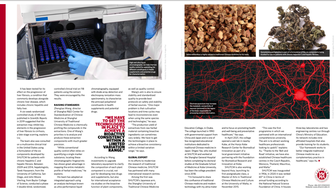 在中药标准提高方面,特刊介绍了王峥涛教授团队的研究成果。中药研究所科研团队针对中药药效物质基础不明确、中药质量标准体系不健全等问题,依托中药标准化教育部重点实验室、上海中药标准化研究中心,以更精确的方式分析、解析中药成分,以在有限的变化范围内实现化学与生物活性的一致性,确保中药及其制剂的稳定性,为确保临床用药来源的准确性、有效性、安全性提供标准化方案。该研究团队致力于中药国家标准研究的制订、中药质控技术方法的发展和创新研究,构建了国内外第一家以中药标准化研究与技术开发为宗旨的专业化的研究机构与公共服务技术平台,在中药标准研究领域做出重要贡献。