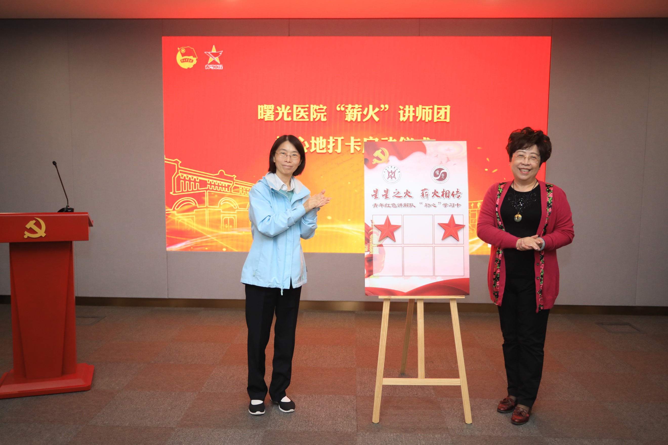 双方领导一起为曙光医院“薪火”讲师团“初心”学习计划学习卡启动打卡。讲师团的青年们在“不忘初心、牢记使命”主题教育、“四史”学习教育、党史学习教育期间,自发为医院职工进行党史、抗疫等内容的主题宣讲,也报名参加“红色巴士”志愿者讲解队,开展红色文化志愿讲解60余场,未来还将不断用党的理论和精神武装自己的头脑。