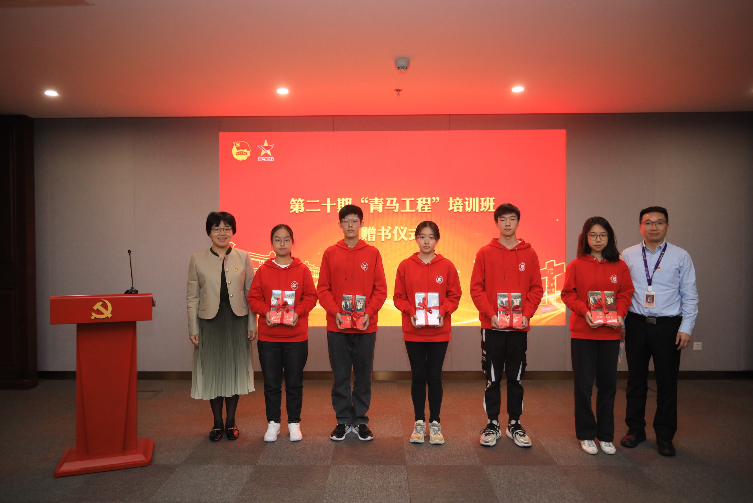 第二十期青马工程培训班学员代表接受赠书,体现学校对青马班学员阅读理论著作、坚定马克思主义信仰的期望。