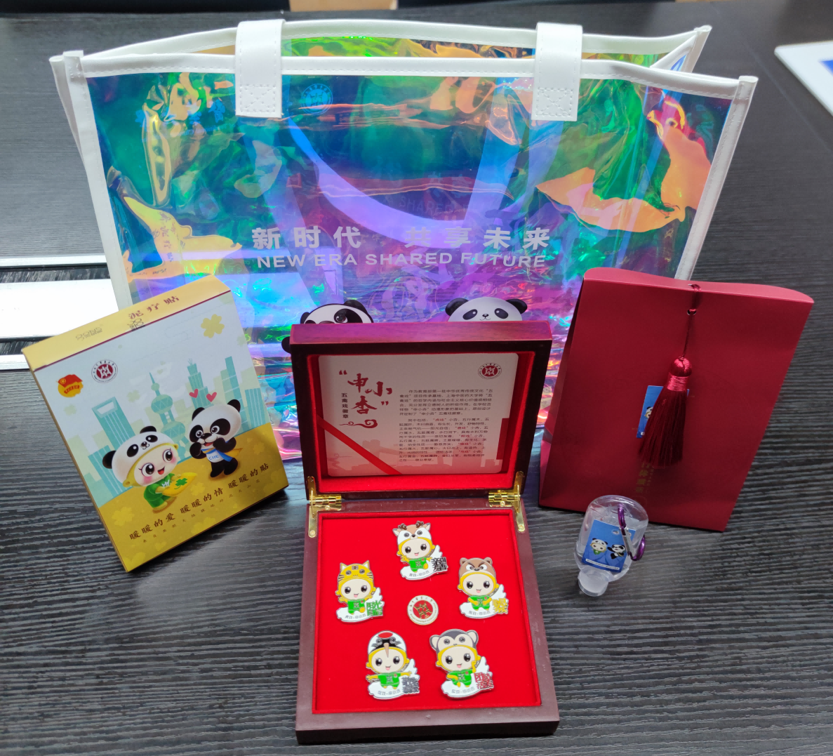 与会领导为志愿者代表送上“五禽戏”徽章和学校特别准备的具有中医特色的进博大礼包。上中医定制镭射袋中有防疫用品和运用中医原理的泥疗贴,在彰显志愿者服务精神的同时,更显中医药院校特色。