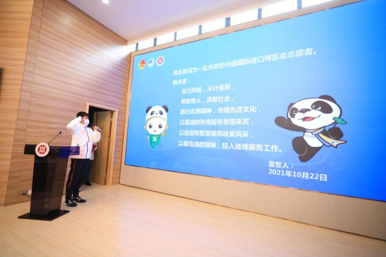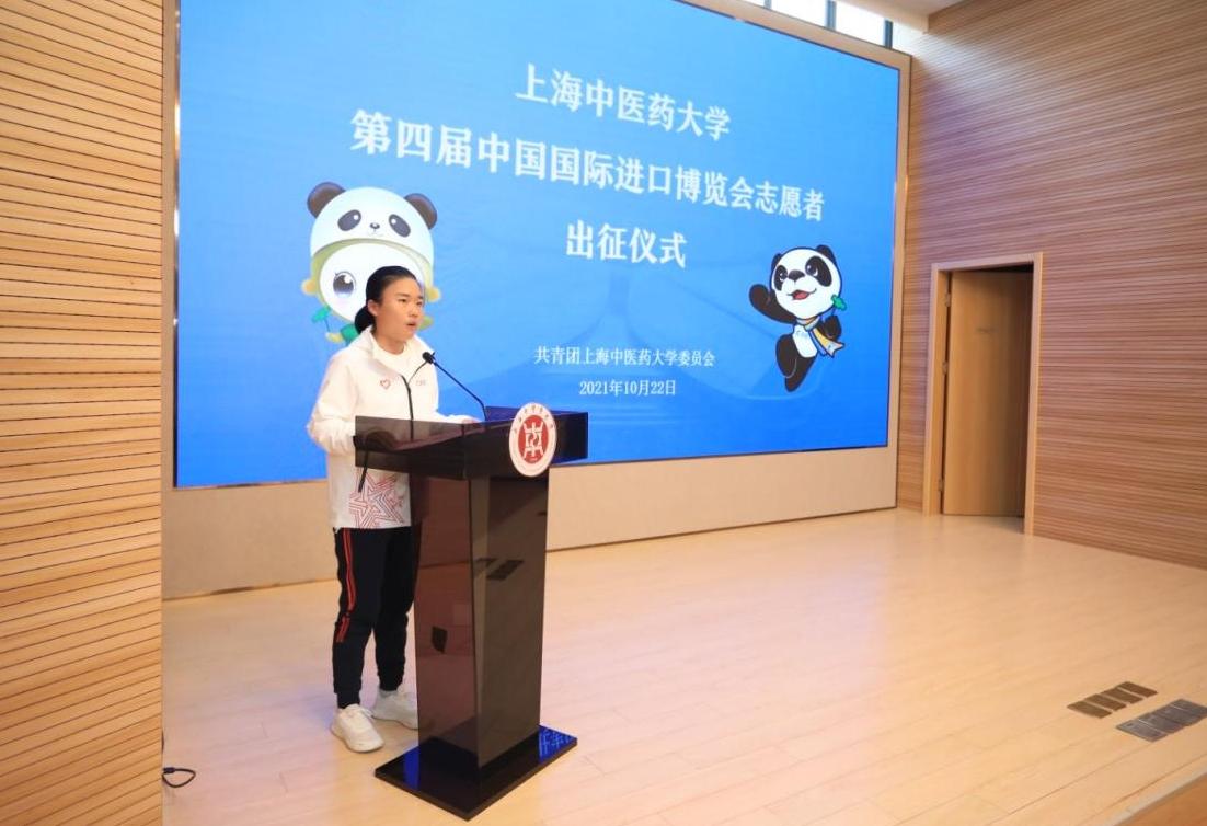 第四届进博会学生志愿者代表刘豫发言,她表示,志愿者们不仅要提供周到的志愿服务,更应该具备专业技能和知识储备,做到认真负责、自信阳光、积极热情,通过培训中不断提高本领,逐步熟悉工作环境,用脚步丈量进博会,做新时代新青年的代言人,用青春热情点燃进博之光。