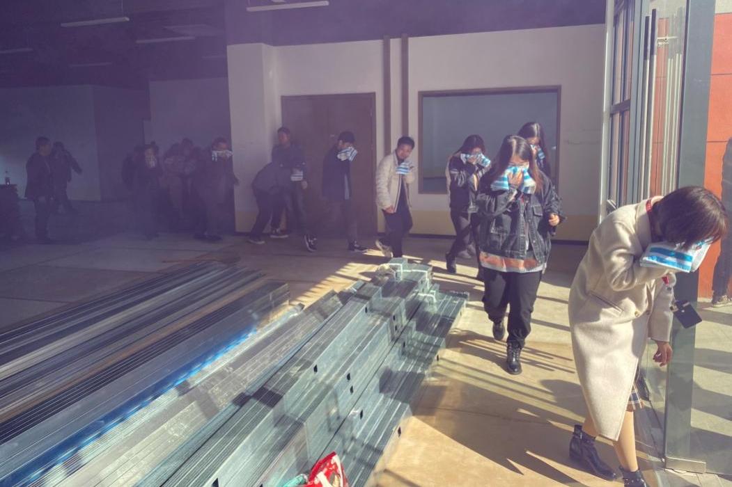 消防逃生演练在学校科技创新楼北侧的一间实验室进行。保卫处金治佳现场讲解火灾逃生的基本知识和注意事项。现场模拟某一实验室突发火情产生大量浓烟,火灾报警广播预警后,参加演练人员在保卫处及由保安组成的工作人员的指引调度下,用湿毛巾捂鼻、低势行进等方法,从消防安全通道迅速、有序地从逃生口撤离到安全地点。在清点人员全部安全撤离后,金治佳对逃生演练进行总结。