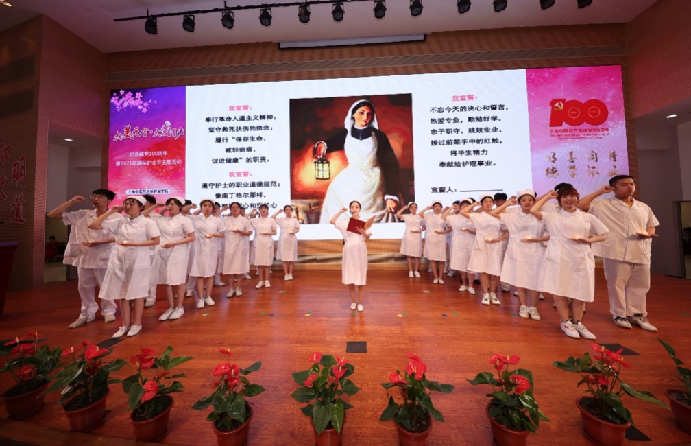 护理学院党总支书记史美育带领师生回顾了我国医疗卫生事业发展的百年征程,在党的领导下,一代代护理人为健康中国建设不懈奋斗。情景剧《红色护理》从老红军战士的回忆直观再现了从抗战时期到新中国成立以来,我国医疗卫生事业的蓬勃发展和护理人的奉献担当,充分诠释了信仰底色。