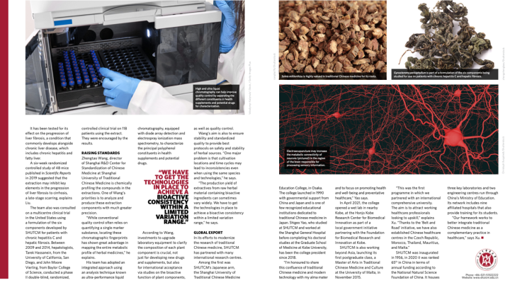 在中药标准提高方面,特刊介绍了王峥涛教授团队的研究成果。中药研究所科研团队针对中药药效物质基础不明确、中药质量标准体系不健全等问题,依托中药标准化教育部重点实验室、上海中药标准化研究中心,以更精确的方式分析、解析中药成分,以在有限的变化范围内实现化学与生物活性的一致性,确保中药及其制剂的稳定性,为确保临床用药来源的准确性、有效性、安全性提供标准化方案。研究团队致力于中药国家标准研究的制订、中药质控技术方法的发展和创新研究,构建了国内外第一家以中药标准化研究与技术开发为宗旨的专业化的研究机构与公共服务技术平台,在中药标准研究领域做出重要贡献。