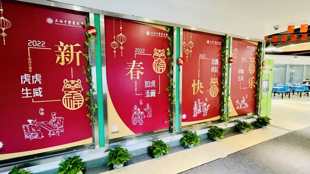 春节前夕,学校为留校学生打造了“一站式”社区过年“家”体验,让这里的年味和家里一样温暖红火。一张张虎年福字暖意融融,一串串大红灯笼高高挂起,一件件萌虎玩偶寓意吉祥。