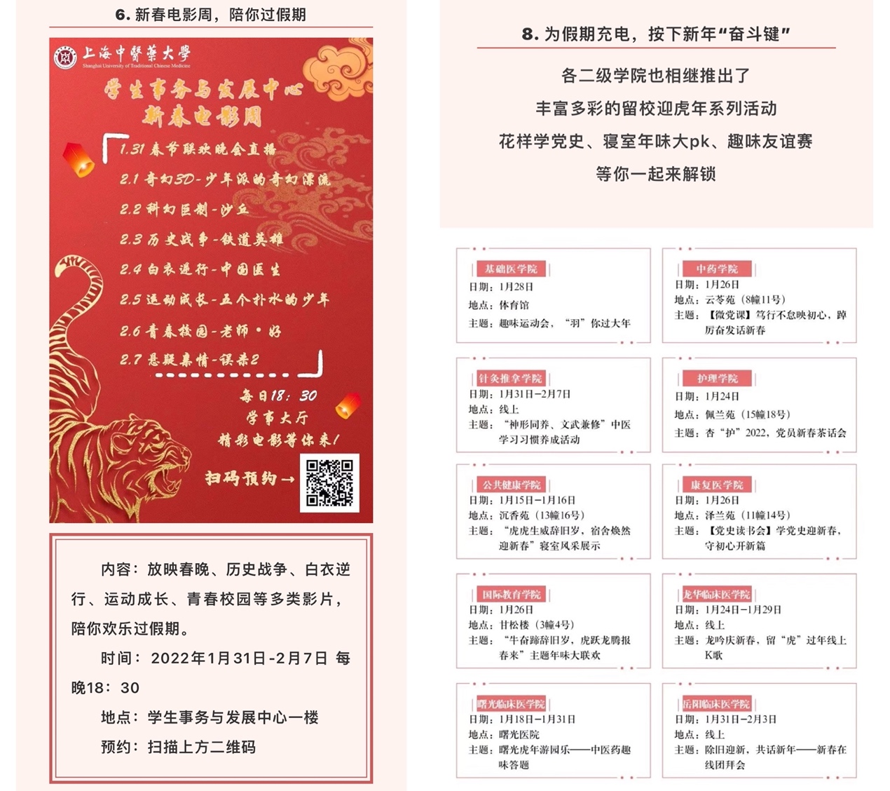 初一至初七,学生还可以报名参加“相约社区活动室”“学事七天乐”“新春电影周”等丰富多彩的活动。第一次在沪留校过年的2020级中药学本科生王俞茜表示,“留校过年的每一天都充满惊喜,学校准备的活动又有趣,又贴心,在这里过年也很热闹,虽然没回家,但一样能感受到独属于家的幸福感和归属感。”