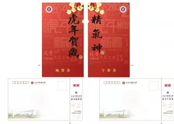 除夕夜,学生食堂将推出“岐黄年夜饭”套餐,供留校过节的学生免费领取。不仅有美食享用,连年夜饭的领餐券也精心设计成“虎年独家定制版”明信片。同学们吃完饭后,可以将载满祝福的卡片寄出,给未能团聚的亲朋好友送去上中医独特的“年”味祝福。