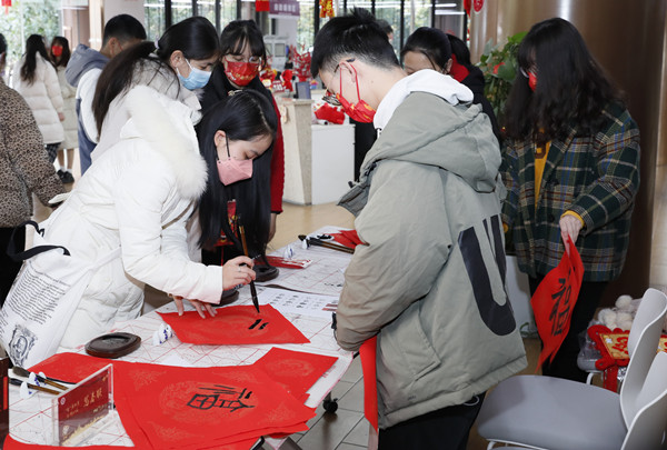 1月31日除夕一早,热热闹闹的“五福游园会”拉开了迎新春系列活动的序幕。迎祥纳福是过年特有的习俗,为弘扬中华优秀传统文化,学校把中医药文化体验融入春节民俗活动。写福字、制香囊、五禽戏、诗词接龙、新春插画、DIY灯笼等活动,动手动脑还舒展筋骨,活动受到学生们的欢迎。同时,为做好疫情防控工作,活动采用了分时段预约的方式进行,让师生们分批分散参与。