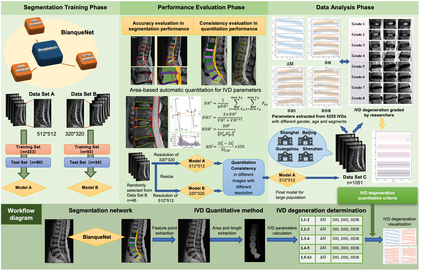 深度学习图形分割网络训练与椎间盘退变量化方法示意图