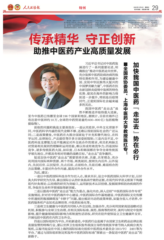 人民政协报:全国政协委员、伟德国际victor1946官网教授陈红专:加快我国中医药“走出去”势在必行