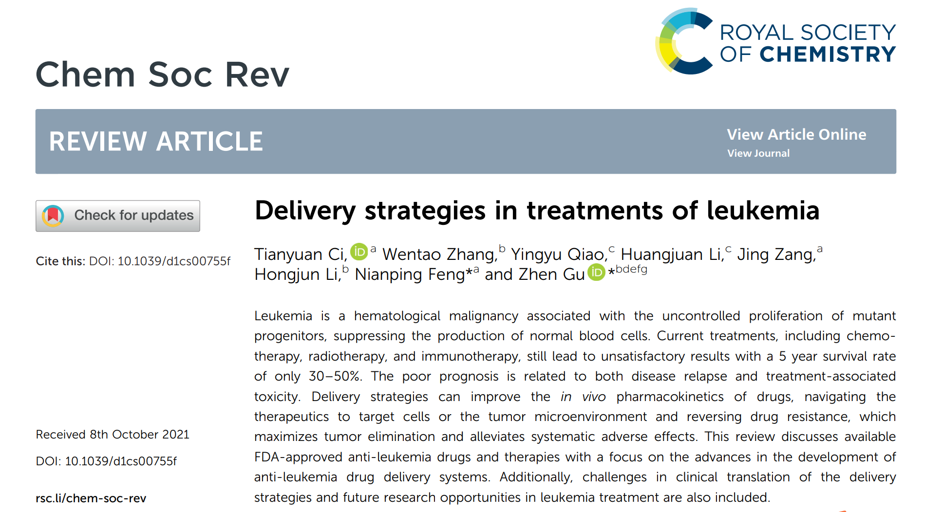近日,伟德中药学院慈天元、冯年平团队在国际化学顶级综述期刊Chemical Society Reviews上发表针对白血病治疗的递药系统及最新进展的综述文章Delivery strategies in treatments of leukemia。伟德中药学院副教授慈天元为论文第一作者,浙江大学教授顾臻与伟德中药学院冯年平教授为论文共同通讯作者,伟德为论文第一完成单位。