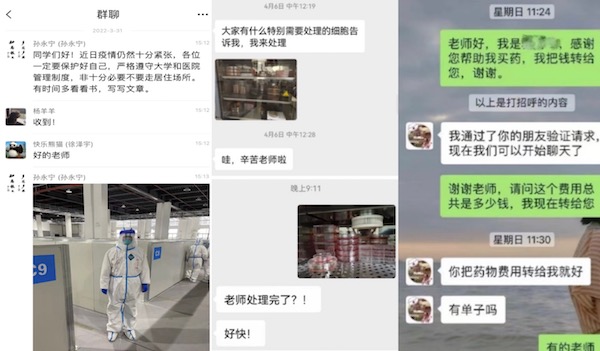 疫情期间,除了最基本的生活保障,老师们也持续关注学生如何获取急需的药物等问题。4月13日,护理学院2位同学因长期必需服用的药品耗尽分别向刘晓、刘慧两位辅导员老师求助买药。在得知此事后,护理学院党总支书记史美育老师和副院长廖晓琴老师主动帮助学生找寻方法,最终成功购得药物送到学生手上。