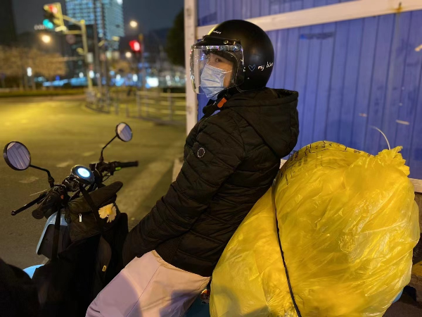 图说:彭浦镇社区卫生服务中心护士骆文婷在采样结束后,带着医废穿梭在街头 采访对象供图