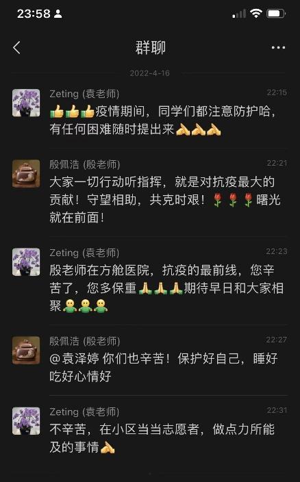 直到后来,有同学偶然给夏琪看了一张新闻截图,照片中是穿着“大白”防护服的殷老师,照片下方标注着一行小字“上海普陀跨采中心方舱医院院长 殷佩浩”。这时她才意识到,老师每次的深夜关心背后,都藏着许多看不见的操劳与辛苦。夏琪说:“在这场疫情中,有诸多考验在大家面前,有些是物质层面,而有些是心理层面,不过有殷老师在我们面前做榜样,我相信我一定不会被这些简单的困难所打倒。”