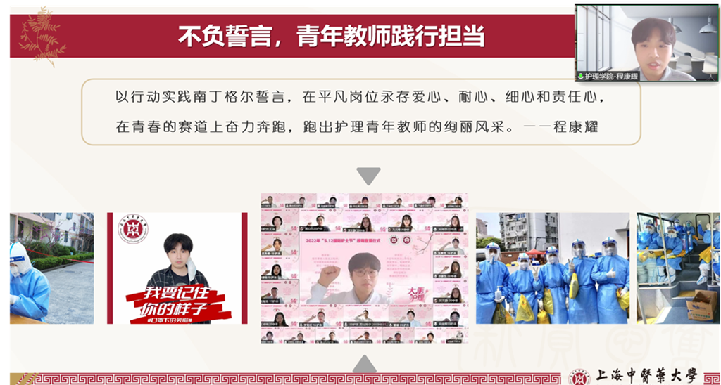 护理学院青年教师程康耀,在本轮疫情防控工作中,作为学校支援浦东新区核酸检测志愿服务队领队之一,带领70人师生队伍支援浦东核酸大筛查,顺利完成为期10天的志愿工作,累计核采12万人次。在今年伟德护理学院护士节主题活动中,他作为领誓人带领近两百名即将步入临床学习的护生线上宣誓。