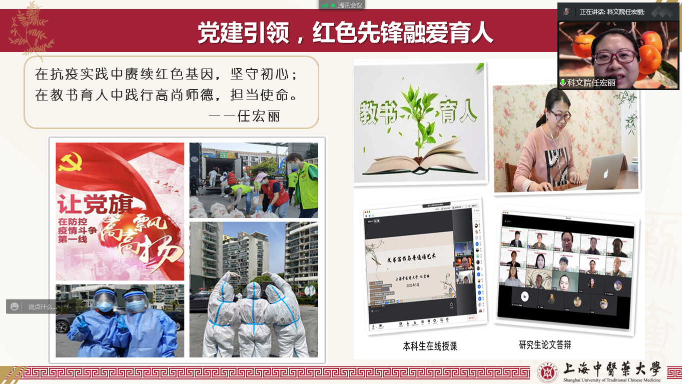 科技人文研究院第二党支部书记任宏丽是医古文教研室的副教授。特殊时期,作为教师党支部书记,她以党建引领教师思政,带领支部党员凝心聚力,为抗击疫情冲锋战斗;作为学生导师,她主动关爱,悉心指导,呵护学生心灵,指导学生学术。
