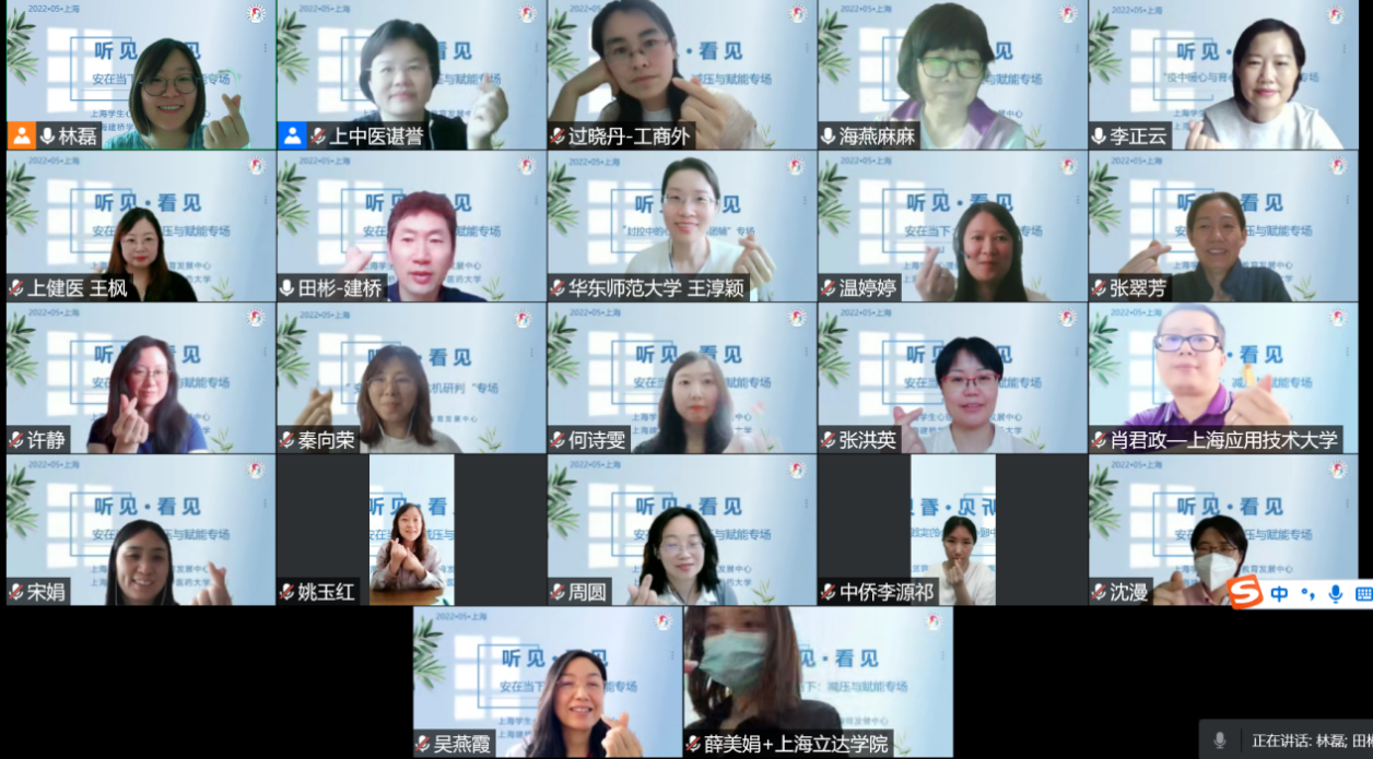 5月31日,上海学生心理健康教育发展中心主办,上海中医药大学和上海建桥学院联合举办“听见·看见”系列——安在当下,疫情中的辅导员减压与赋能专题研讨会。上海学校心理健康教育发展中心主任李正云、伟德学工部(研工部)部长沈漫和近20所高校心理中心负责人与专兼职心理教师等参与。伟德心理咨询与发展中心林磊主持会议。