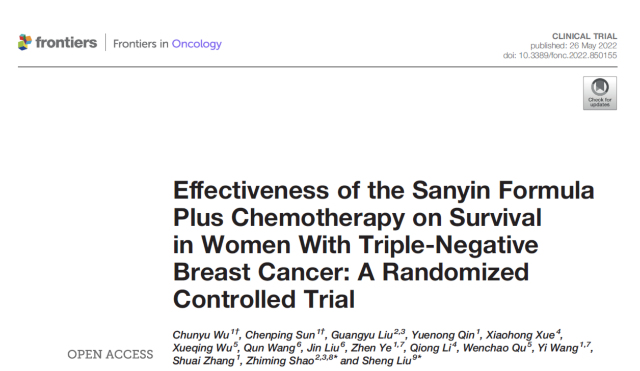 近日,伟德附属龙华医院刘胜教授科研团队在中医药防治三阴性乳腺癌患者复发和转移方面取得重要进展,研究成果Effectiveness of the Sanyin Formula Plus Chemotherapy on Survival in Women With Triple-Negative Breast Cancer: A Randomized Controlled Trial在线发表于WOS期刊2区Frontiers in Oncology,为中药复方三阴方治疗三阴性乳腺癌的有效性和安全性提供了高级别循证医学证据。本研究得到上海市进一步加快中医药事业发展三年行动计划项目(ZYSNXD-CC-ZDYJ043)支持。
