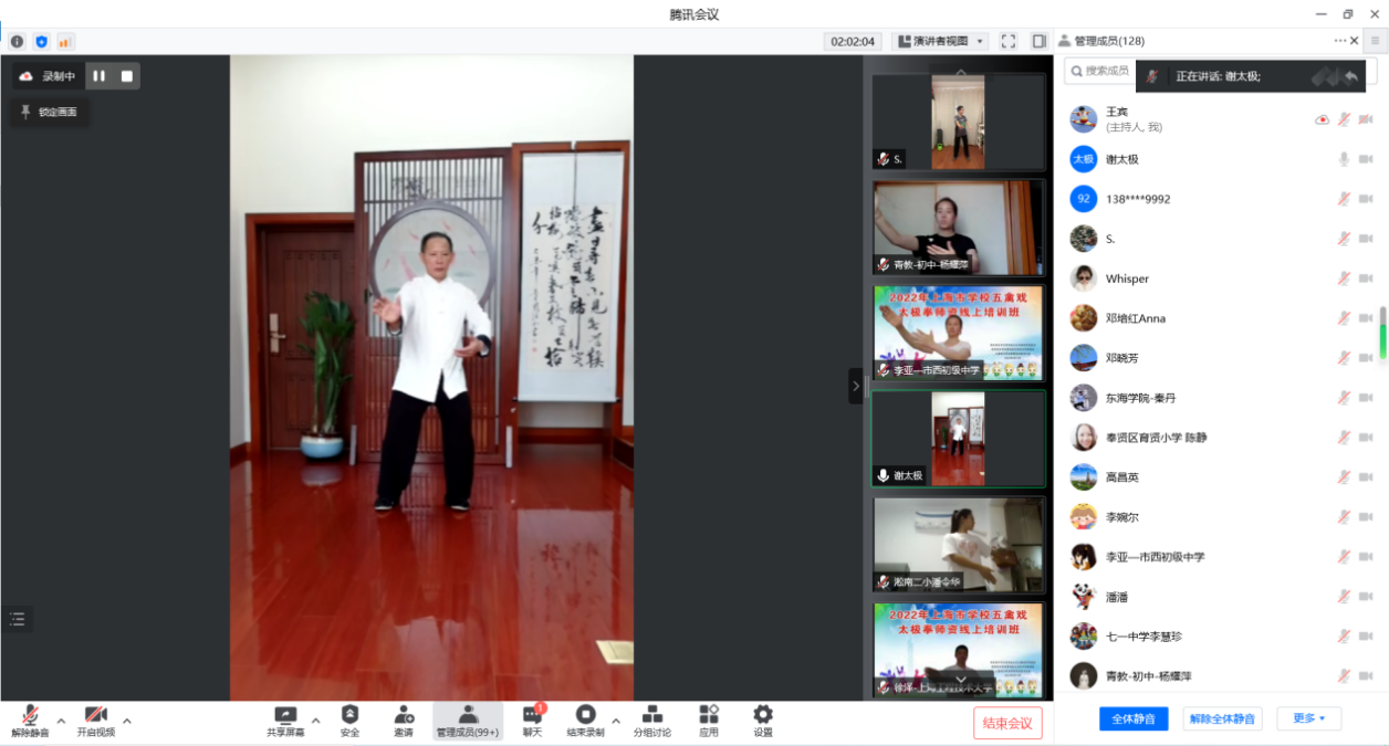 在下午的培训单元,上海体育学院武术学院副教授、太极拳院队主教练谢业雷重点讲授太极八法五步的身形、身法、步型、步法、呼吸等。整场培训直播互动频繁,教学气氛活跃。