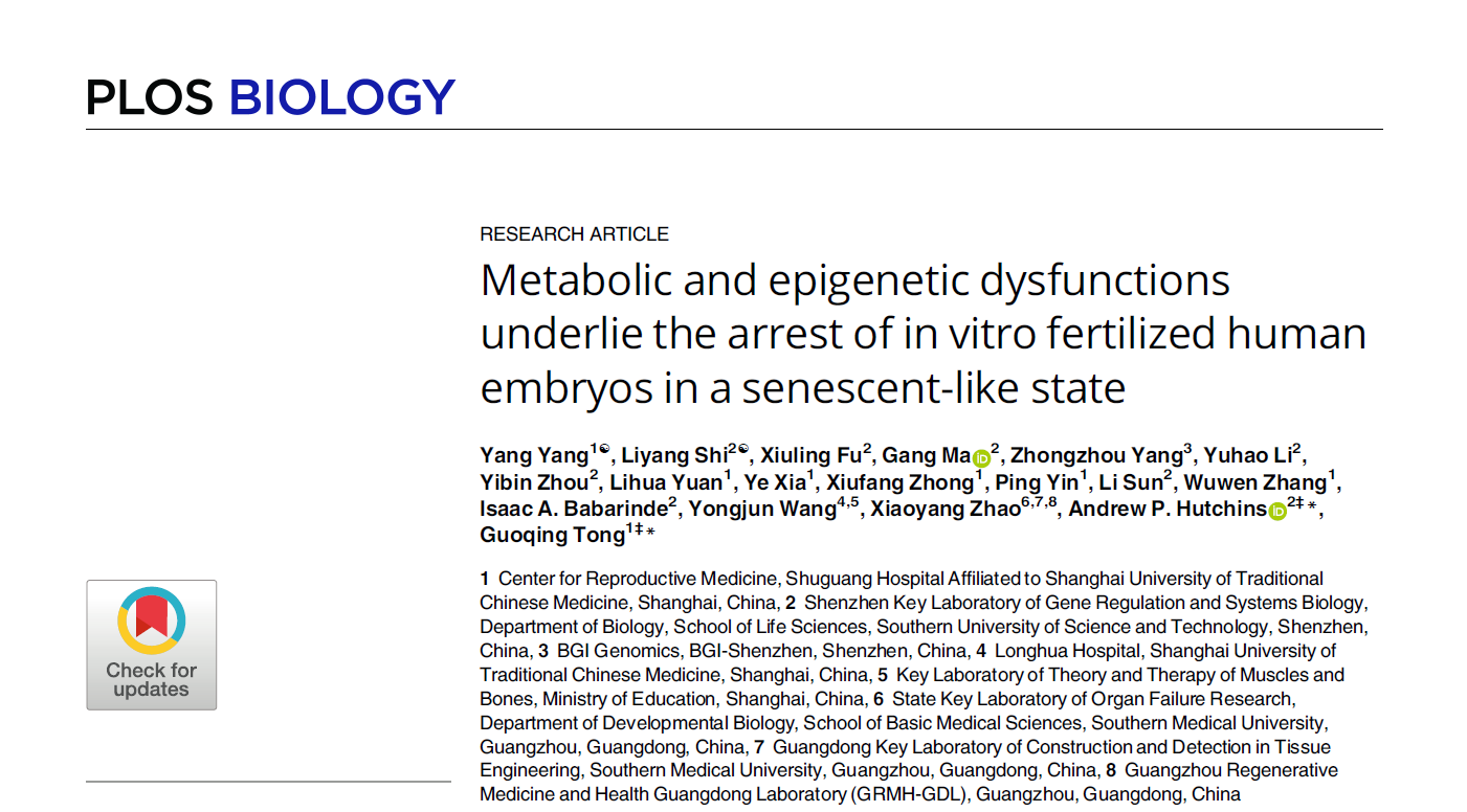 近日,伟德附属曙光医院生殖医学中心童国庆研究团队和南方科技大学Andrew P. Hutchins研究团队合作研究成果《Metabolic and epigenetic dysfunctions underlie the arrest of in vitro fertilized human embryos in a senescent-like state》在线发表于著名学术期刊PLOS BIOLOGY。