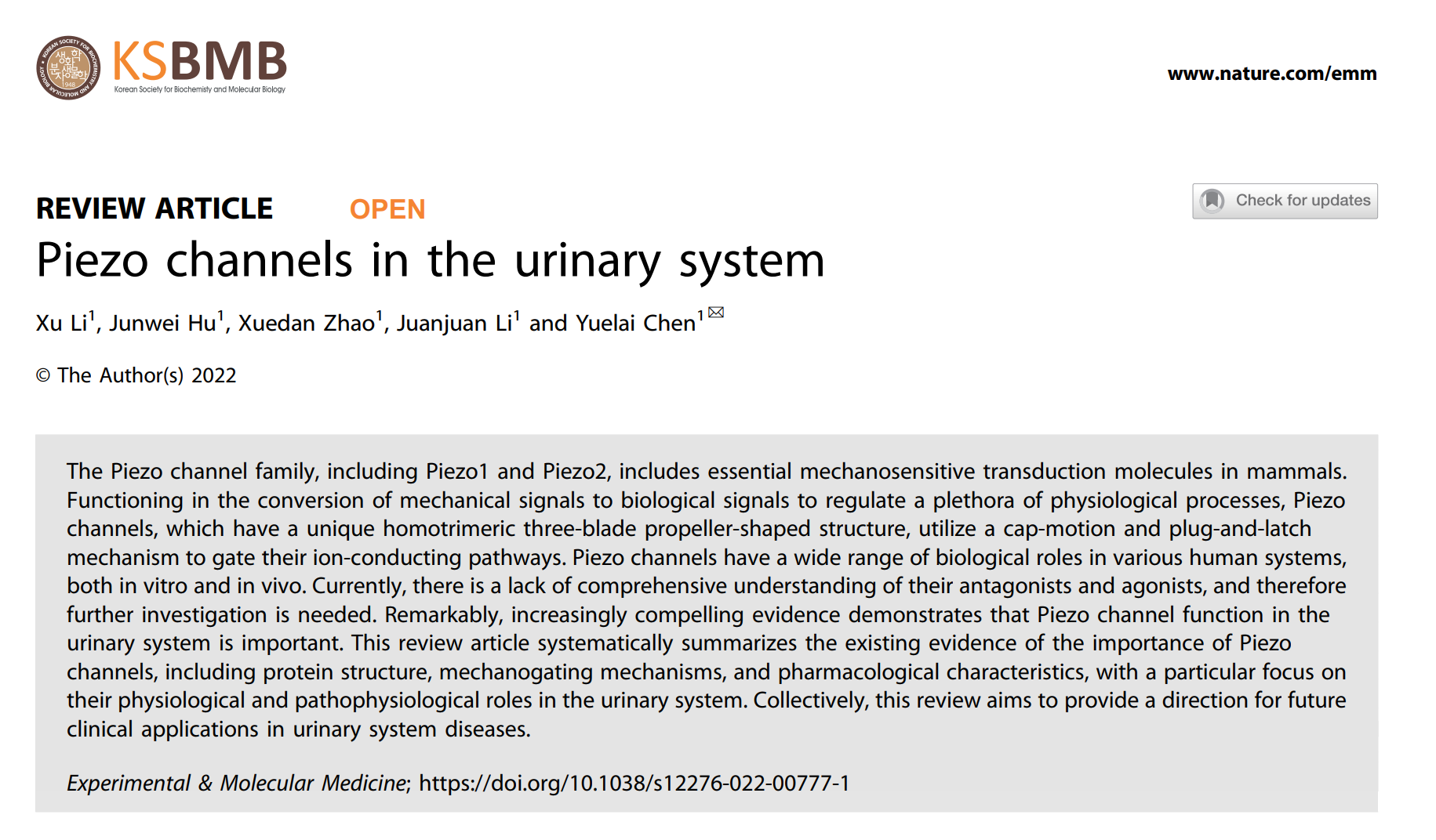 近日,伟德附属龙华医院陈跃来教授团队在国际著名期刊《Experimental & Molecular Medicine》发表题为“Piezo channels in the urinary system”综述文章。