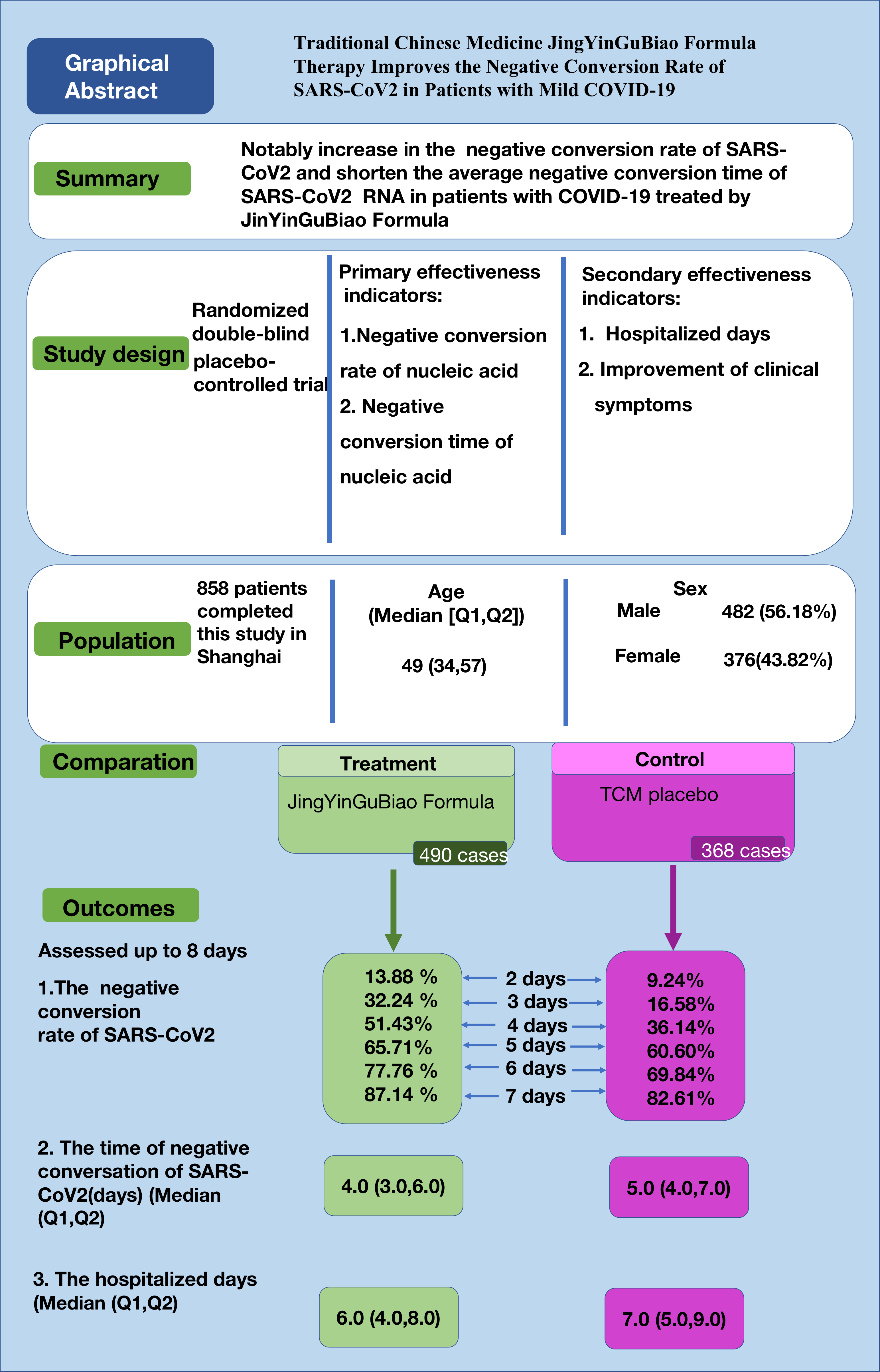荆银固表方是国家中医药疫病防治基地(伟德国际victor1946官网附属曙光医院)联合上海市有关中医药专家制定的《上海市新型冠状病毒感染中医药诊疗专家共识(2022 春季版)》推荐的中药复方。该项研究旨在评价中药荆银固表方治疗轻型COVID-19感染者的安全性和有效性。今年4月8日至5月6日,885例患者随机分为荆银固表方组或中药安慰剂组,疗程7天,主要疗效指标是SARS-CoV2 RNA的转阴率和转阴时间,次要疗效指标是住院天数和症状改善情况。疗程结束,共858例患者完成疗效评价。