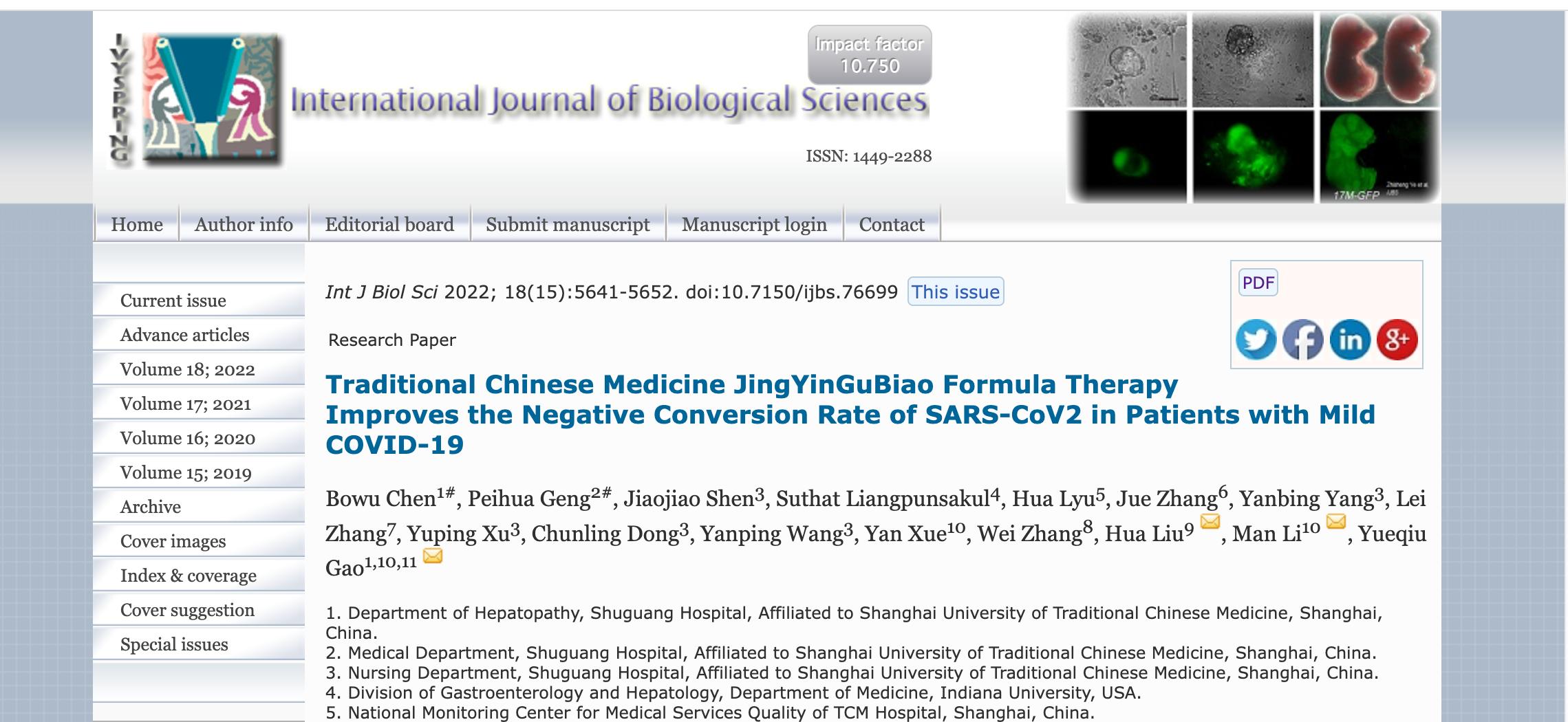 9月1日,伟德附属曙光医院高月求教授研究团队在JCR分区Q1期刊International Journal of Biological Sciences发表最新研究成果Traditional Chinese Medicine JingYinGuBiao Formula Therapy Improves the Negative Conversion Rate of SARS-CoV2 in Patients with Mild COVID-19。据检索,该成果为中医药治疗COVID-19奥密克戎变异株感染的首篇随机、双盲、中药安慰剂对照临床研究SCI收录论文。