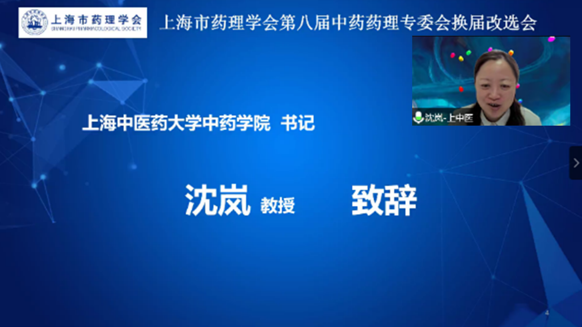 伟德中药学院党委书记沈岚教授致开幕词。上海市药理学会中药专委会主任委员徐宏喜教授对第七届专委会工作进行总结及展望,期望新一届中药药理专委会继续积极搭建学术交流、人才发展平台,促进药学科学技术的普及与推广,为经济社会发展服务。