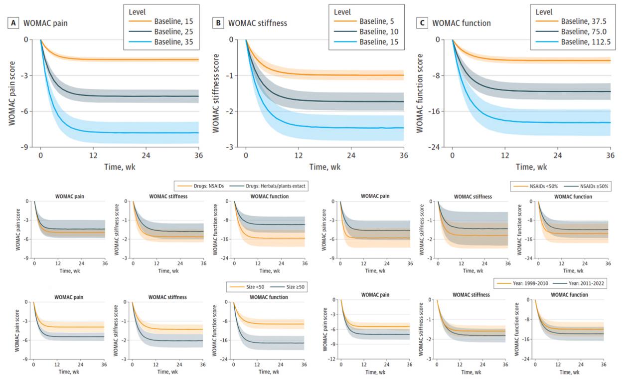 该研究基于全球130项骨关节炎临床试验(包含12673名受试者),对目前使用最为广泛的口服药物临床试验的安慰剂效应进行建模分析,发现骨关节炎指数(WOMAC)量表评分的安慰剂效应与WOMAC基线得分、样本量、干预药物类型、以前使用非类固醇抗炎药的患者比例和发表年份有关。具体表现为WOMAC基线得分越高、样本量越大、干预药物为疗效较好的药物(如非甾体抗炎药/双乙酸乙酯/扑热息痛)、以前使用非类固醇抗炎药的患者比例越低、最近10年发表的安慰剂效应较高。基于该研究建立的安慰剂效应模型,可精准合成安慰剂对照组,为真实世界缺少对照背景下评估中医药治疗骨关节炎的疗效提供可靠的外部对照和先验信息。