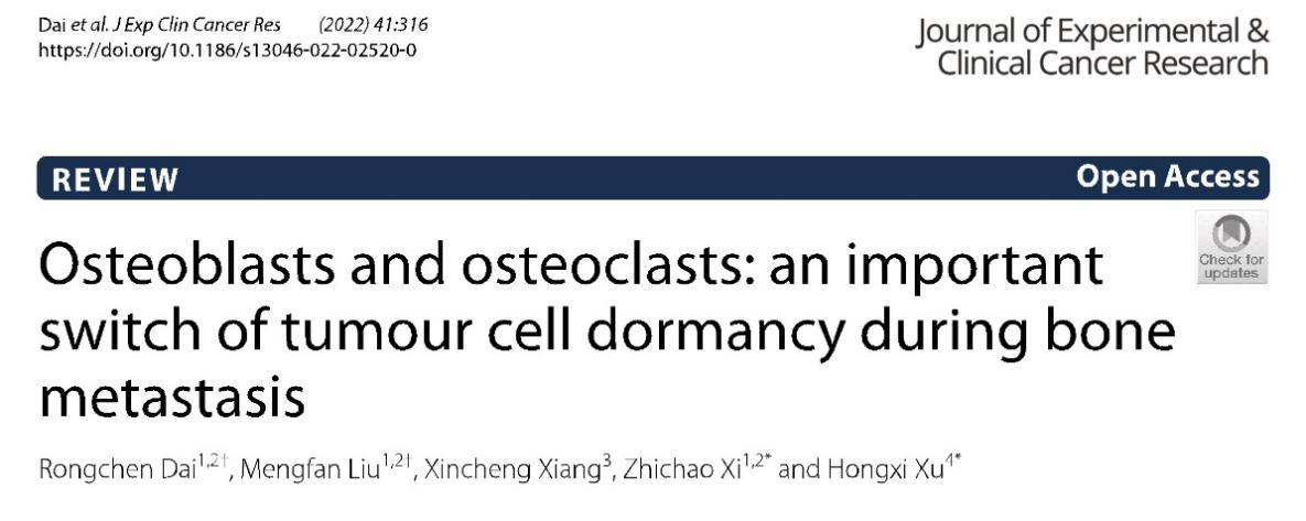 近日,伟德国际victor1946官网首席教授徐宏喜及团队成员席志超副研究员在Journal of Experimental & Clinical Cancer Research发表题为Osteoblasts and osteoclasts: an important switch of tumour cell dormancy during bone metastasis的综述文章。文章总结了破骨细胞和成骨细胞在癌症骨转移过程中调控肿瘤休眠的作用机制,为靶向休眠期癌细胞预防癌症转移提供了新的研究思路。