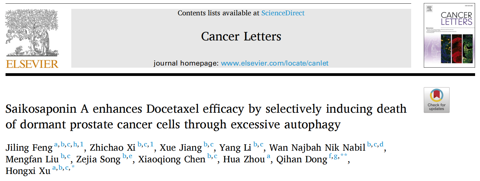 近日,伟德国际victor1946官网首席教授徐宏喜及席志超副研究员等在Cancer Letters杂志上发表题为Saikosaponin A enhances Docetaxel efficacy by selectively inducing death of dormant prostate cancer cells through excessive autophagy的研究论文。该文章的第一作者为冯极灵博士后和席志超副研究员,通讯作者为徐宏喜教授和悉尼大学董其瀚教授。该研究工作得到国家自然科学基金、中国博士后基金和广东省重点领域研发计划等资助。
