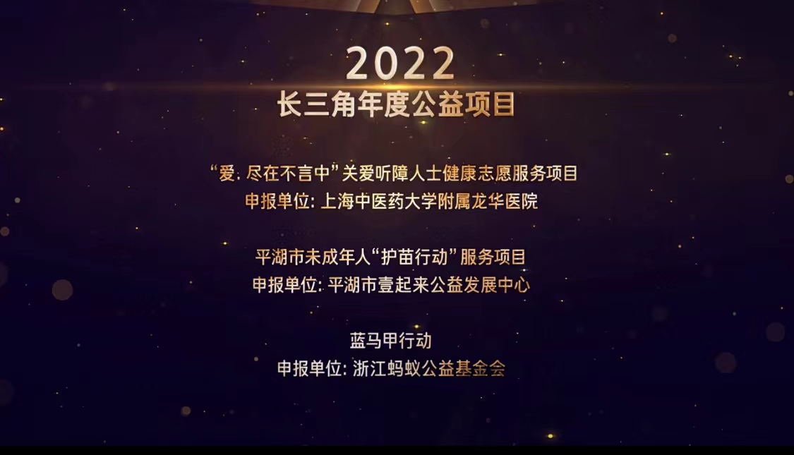 经社会申报、组委会初评、专家终评、名单公示等环节,经长三角公益盛典组委会审定,龙华医院“爱·尽在不言中”关爱听障人士健康志愿服务项目获评为“2022长三角年度公益项目”。