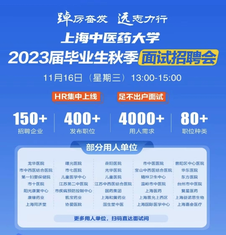 “历年入职和黄药业的上中医学生中,已有多位发展成为中高层管理人才,今年我们对上中医培养的人才更是求贤若渴。期待更多优秀人才的加入,一起为中医药事业添砖加瓦!”上海和黄药业有限公司、上海高校学生职业生涯发展教育校外实践基地的校园招聘负责人施燕表示。本次参会用人单位中有30余家校董企业、校院两级岐黄育人实践基地,提供200多个岗位,当天约90名毕业生通过初面试达成就业意向。