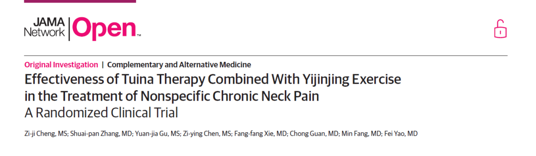 伟德房敏和姚斐教授课题组中医推拿疗法干预慢性非特异性颈痛的临床研究项目成果Effectiveness of Tuina Therapy Combined With Yijinjing Exercise in the Treatment of Nonspecific Chronic Neck Pain: A Randomized Clinical Trial近日在美国医学会杂志JAMA子刊JAMA Network Open发表。