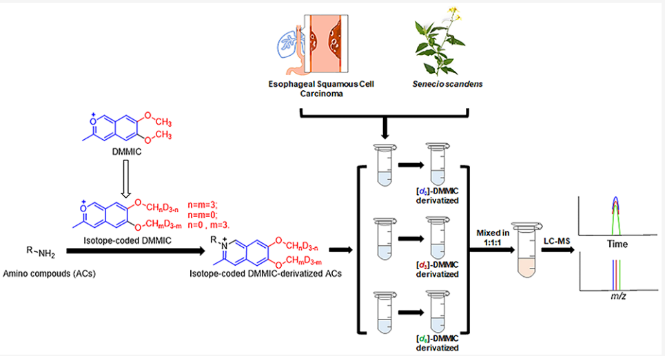 研究团队设计并合成了一种全新的吡喃鎓盐6,7-二甲氧基-3-甲基异铬苯基四氟硼酸盐([d0]-DMMIC)及其稳定同位素标记试剂([d3]-/[d6]-DMMIC)。DMMIC衍生的氨基化合物在液相中具有良好的保留性,自带的电荷标签在电喷雾质谱检测中呈现高灵敏度,来自DMMIC标签离子有助于在液质联用分析中发现潜在的氨基化合物。通过建立检测方法,成功应用于中药千里光中的生物胺以及食管鳞状细胞癌的癌症/癌旁组织中胺类代谢物的分析。