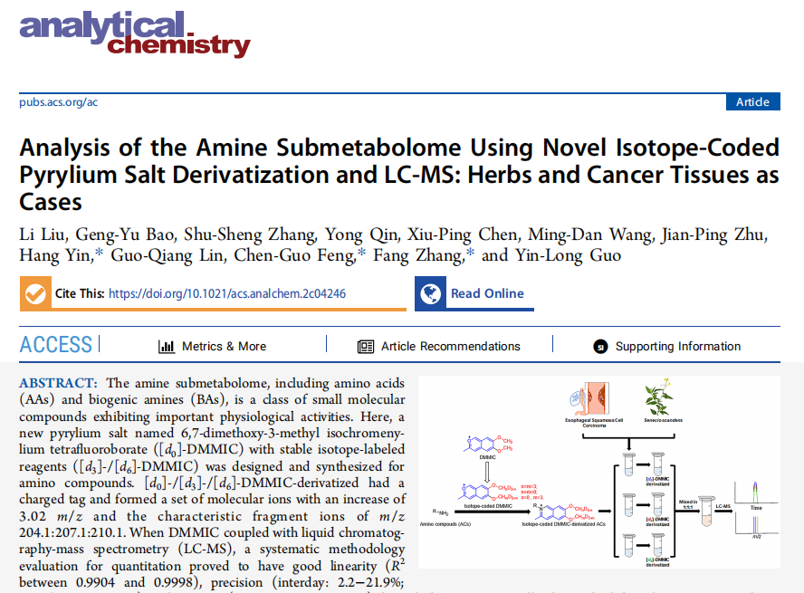 近日,创新中药研究院冯陈国团队在中药及临床样品中内源性胺类化合物的分析难题方面取得研究进展,成果Analysis of the Amine Submetabolome Using Novel Isotope-Coded Pyrylium Salt Derivatization and LC-MS: Herbs and Cancer Tissues as Cases发表于国际权威期刊美国化学会《分析化学》(Analytical Chemistry)。