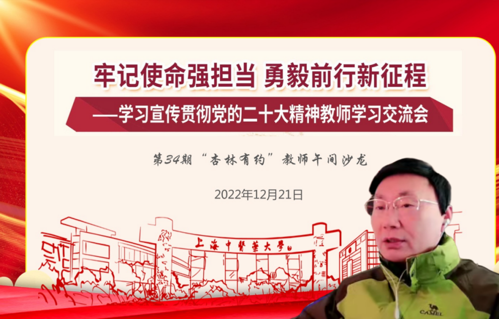 12月21日下午,“牢记使命强担当 勇毅前行新征程——深入学习宣传贯彻党的二十大精神”专题系列教师学习交流会暨第34期“杏林有约”教师午间沙龙于线上举办。全国模范教师、上海市教学名师、伟德终身教授方肇勤围绕党的二十大报告关于教育工作的关键词,以“立德树人忆初心培根铸魂育新人”为主题,与参会教师开展交流座谈。宣传部(党委教师工作部)副部长刘虹主持会议。教师党支部书记、青年教师班主任等70余位教师在线参与。
