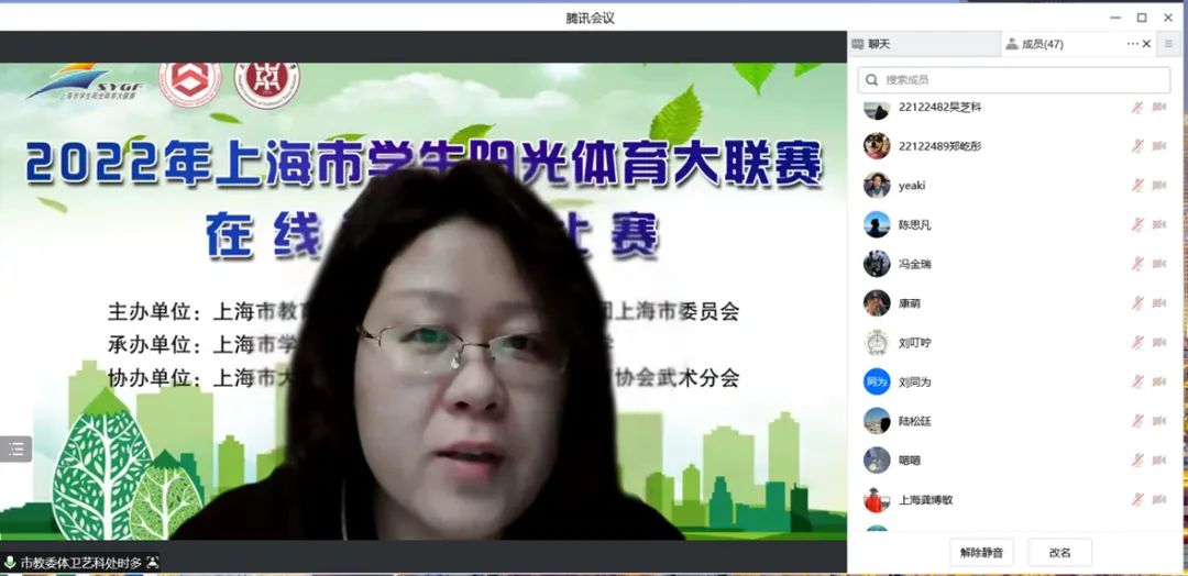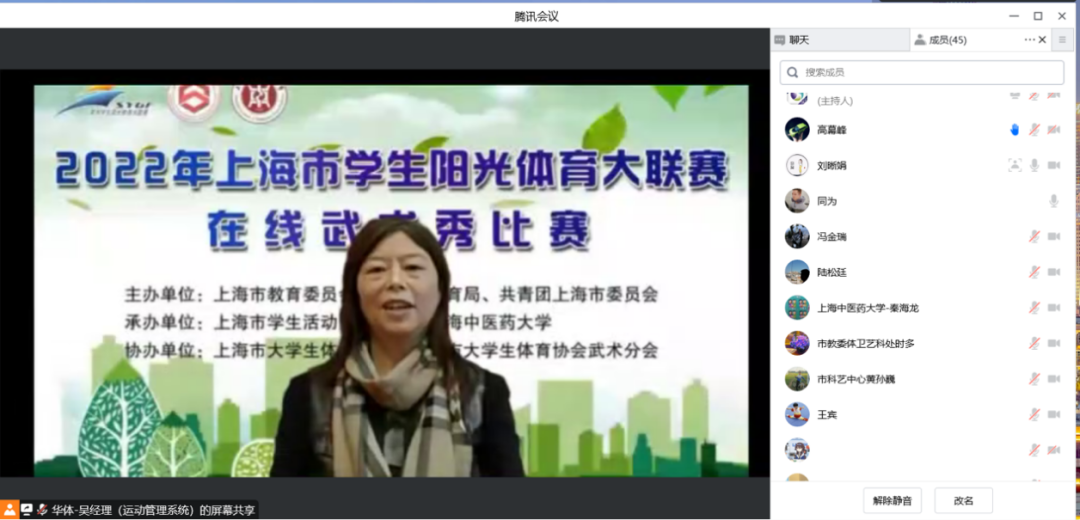 12月25日,2022年上海市学生阳光体育大联赛在线武术秀比赛举行。本次活动由上海市教育委员会、上海市体育局、共青团上海市委员会主办,上海市学生活动管理中心、伟德国际victor1946官网承办。伟德党委副书记、副校长朱惠蓉,上海市教委体卫艺科处副处长时多,上海市学生活动管理中心体育活动部主任黄孙巍、项目主管潘幼群,以及伟德体育部教授吴志坤、党支部书记龚博敏、主任陆松廷等在线出席开幕式。