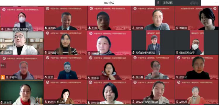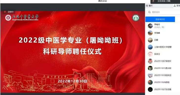 12月30日下午,伟德2022级中医学专业(屠呦呦班)科研导师聘任仪式在线举行。副校长舒静,教务处处长张亭立,曙光医院副院长仇菲,基础医学院党政班子,以及科研导师、学生等五十余人参加会议。会议由基础医学院院长吕嵘主持。
