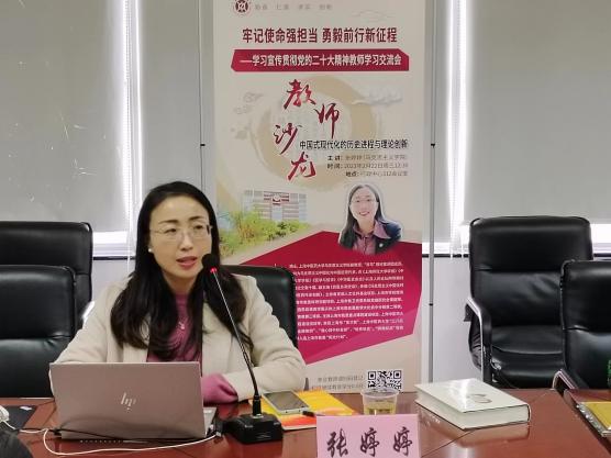 为持续深入学习宣传贯彻党的二十大精神,引导广大青年教师从党的二十大精神中汲取奋进的力量,2月22日下午,“牢记使命强担当 勇毅前行新征程——深入学习宣传贯彻党的二十大精神”专题系列第三期教师学习交流会暨第35期“杏林有约”教师午间沙龙在行政中心312会议室举办。伟德“杏马”理论宣讲团成员、马克思主义学院副院长张婷婷副教授受邀作专题辅导报告,主题为“中国式现代化的历史进程与理论创新”。宣传部(党委教师工作部)副部长刘虹主持会议,并向张婷婷颁发“阳光导师”荣誉证书。教师党支部书记、青年教师班主任等40余位教师参加学习交流。