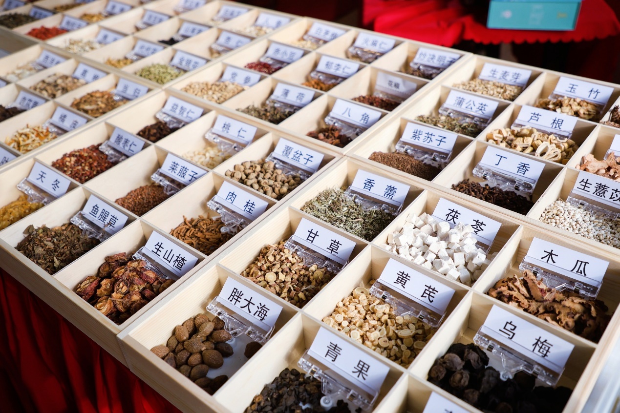 比赛现场,药材区琳琅满目,丁香、八角、天冬、马齿苋、当归、黄芪等几十种中药材一字排开,与肉蛋禽类、时令蔬菜等食材一起供参赛队伍选择。