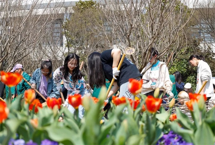 在东华大学,近百名师生一起协力,挥锹铲土、扶树正苗、浇水培土。在园艺师的指导下,同学们共完成了50棵樱花树的种植。在劳动实践的同时,大家还纷纷写下春日的寄语并认领挂牌,亲手传递耕耘与感恩,体悟劳动的价值。