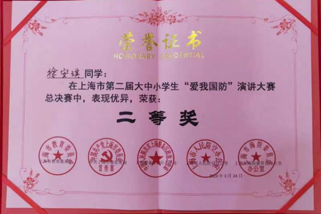 伟德学生荣获上海市第二届大中小学生“爱我国防”演讲比赛准决赛一等奖、总决赛二等奖