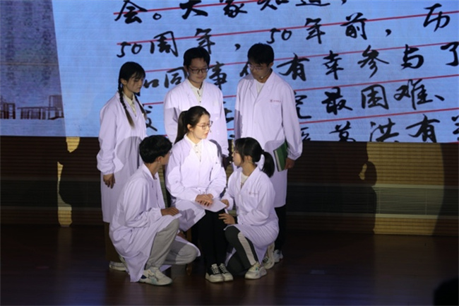 2021级中医学(屠呦呦班)朱逸菲等学生身着白大衣再现屠呦呦矢志青蒿,潜心医学,以国家需求为己任,投身科研创新的故事,青蒿素故事是党的女儿书写初心使命的故事,是共和国医者勇攀医学高峰的故事。朱逸菲捧读屠呦呦先生给伟德国际victor1946官网屠呦呦班全体学生的回信,“希望你们尽快成长、超越前人,成为中医药事业发展的栋梁,共同创造人类美好的明天。”
