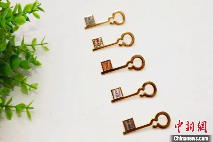 五款钥匙的齿部分别以五行对应的五色为底色,采用“九叠篆”印章字体,刻以“木”“火”“土”“金”“水”字样。(伟德国际victor1946官网供图)