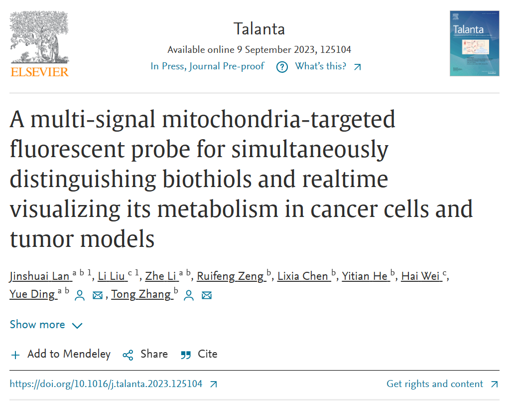 中药学院张彤团队成功构建多通道线粒体靶向荧光探针用于肿瘤内生物硫醇代谢监测