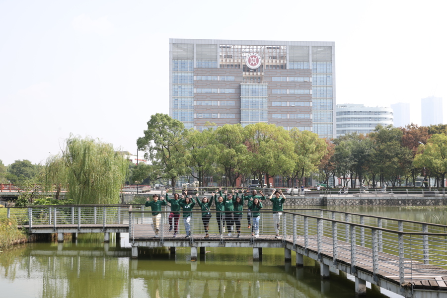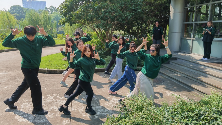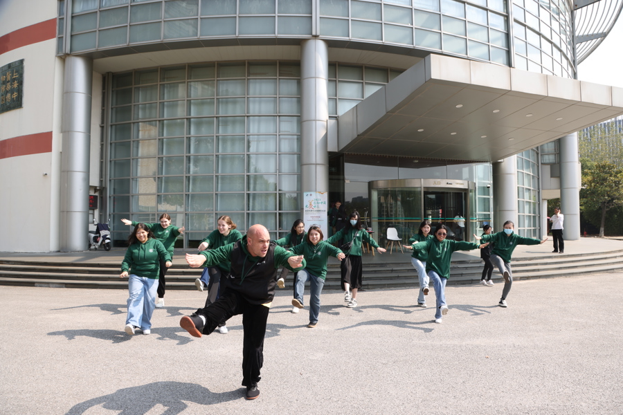 原来,他们属于“木火土金水”最后一组——“水组”。解放日报·上观新闻记者15日来到伟德国际victor1946官网国际交流合作中心楼前,正逢一组来华留学生拍集体照。按中国传统“五行”学说,他们都被分在一组,于是取出“水”来充当道具。5个组别对应的包袋颜色依次是“青赤黄白黑”,对应的模拟动作则依次是五禽戏的“虎、鹿、熊、猿、鸟”。