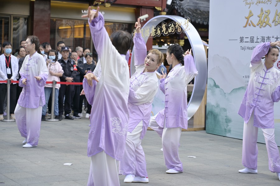 当日,上海气功研究所气道书院外籍学员团队、上中医附属闵行蔷薇小学“五行操”团队以及复星集团旗下星太极,也都展演了传统功法,并与游客进行主题互动,一起分享太极健康文化、体验非遗太极拳的抱手礼,并且身着汉服以太极动作打卡、快闪,一同感受中华优秀传统文化魅力,与当下的文旅新时尚碰撞出新的火花。